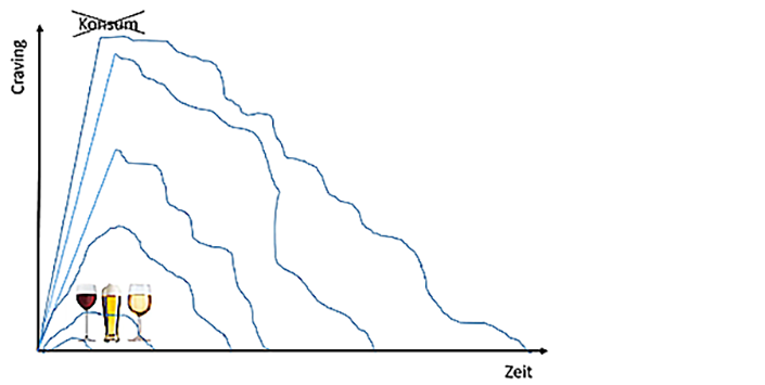 Die Cravingkurve steigt mit der Zeit weniger an und flaut rascher wieder ab. Der wissenschaftliche Hintergrund zum Expositionstraining in der Klinik Südhang für Fachpersonen.